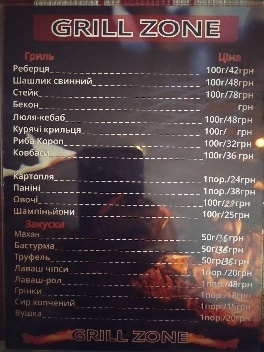 ГРИЛЬ-БАР 'GRILL ZONE' Menu